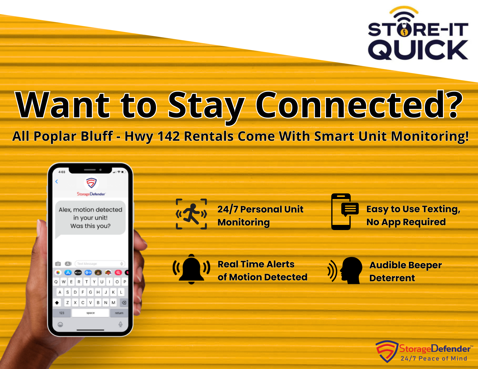 *Smart Unit Service Upgrade Disclaimer: For a limited time, get your first month of StorageDefender’s Smart Unit Monitoring for free! After that, it’s just $15 a month to enjoy added peace of mind with unlimited personal monitoring of your space by real-time text alerts. Opt out at any time, hassle-free. Learn more about Smart Units here!